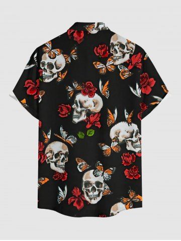Plus Size Skulls Butterfly Flower Print Button Pocket Shirt For Men - Black - M