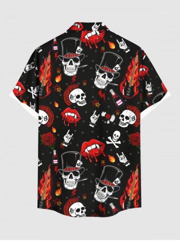 Plus Size Skulls Fireflame Guitar Lips Rose Flower Print Buttons Pocket Shirt For Men - Black - M