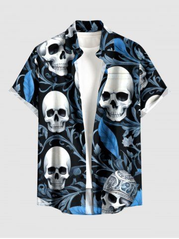 Plus Size Skulls Flower Leaf Print Buttons Pocket Hawaii Shirt For Men - Sky Blue - M