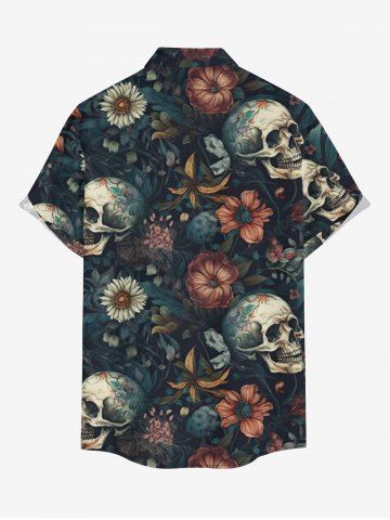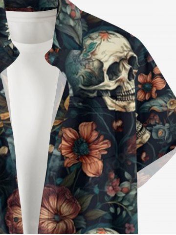 Plus Size Skulls Flowers Print Buttons Pocket Hawaii Shirt For Men - Deep Blue - 3xl