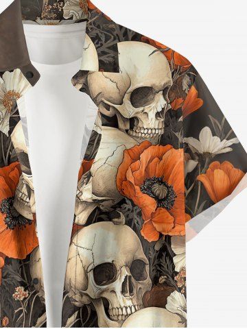 Plus Size Skulls Flowers Print Buttons Pocket Hawaii Shirt For Men - Deep Coffee - 5xl