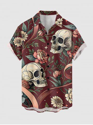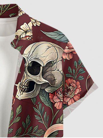 Plus Size Skulls Flowers Print Buttons Pocket Hawaii Shirt For Men - Red Wine - S