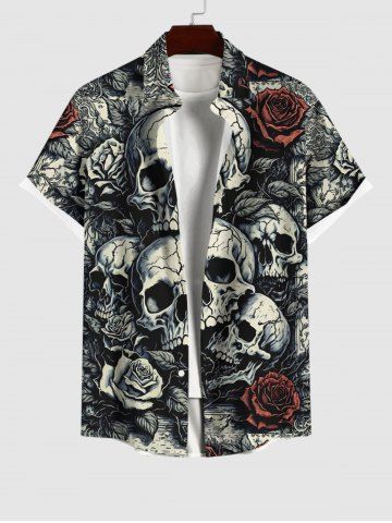 Short Sleeves Shirts > Plus Size Skulls Rose Flower Print Buttons Pocket Shirt For Men