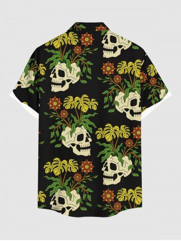 Plus Size Skulls Tropical Leaf Flowers Print Buttons Pocket Hawaii Shirt For Men - Black - M