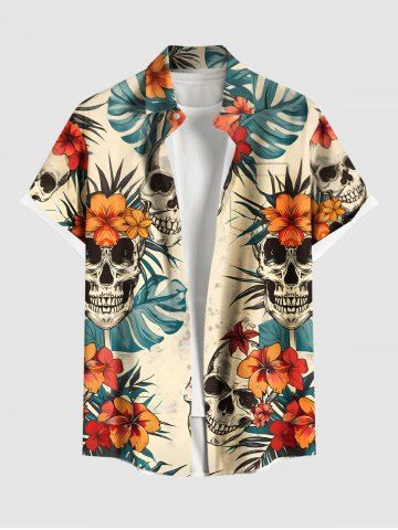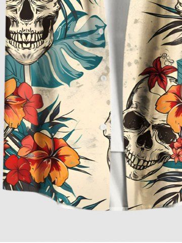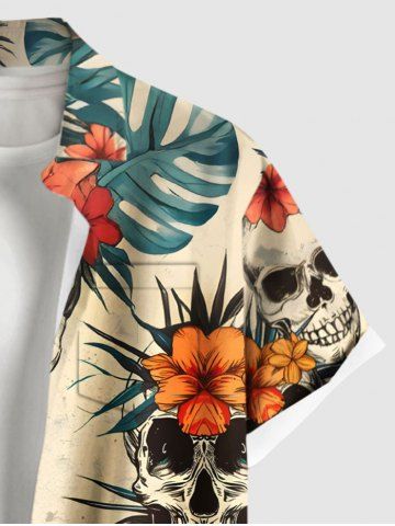 Plus Size Skulls Tropical Leaf Hibiscus Flowers Print Buttons Pocket Hawaii Shirt For Men - Light Coffee - 5xl