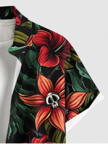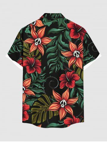 Plus Size Skulls Tropical Leaf Hibiscus Flowers Print Buttons Pocket Hawaii Shirt For Men - Black - 3xl