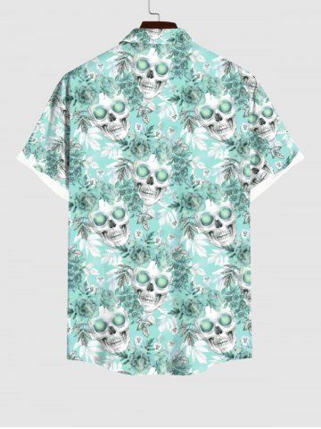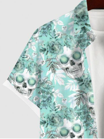 Plus Size Skulls Tropical Leaf Rose Flower Print Buttons Pocket Hawaii Shirt For Men - Light Green - 3xl