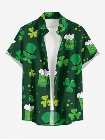 Plus Size St. Patrick's Day Hat Cloves Beer Print Buttons Pocket Shirt For Men - Deep Green - S