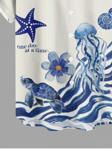Plus Size Starfish Jellyfish Turtle Flowers Print Buttons Pocket Hawaii Shirt For Men - Blue - Xl