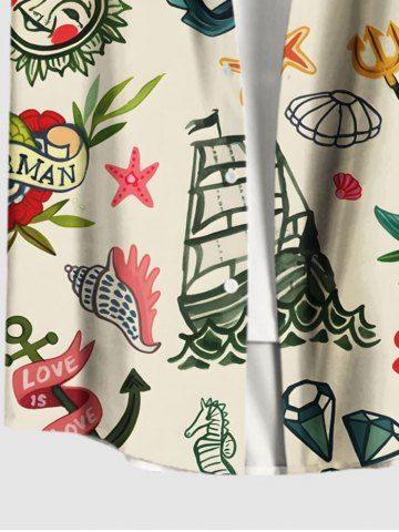Plus Size Sun Mermaid Sailboat Octopus Sea Waves Shell Print Hawaii Button Pocket Shirt For Men - Beige - S