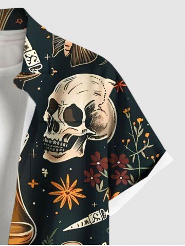 Plus Size Sunflower Flower Skull Bottle Banana Print Hawaii Button Pocket Shirt For Men - Black - 3xl