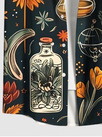 Plus Size Sunflower Flower Skull Bottle Banana Print Hawaii Button Pocket Shirt For Men - Black - 5xl