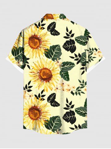 Plus Size Sunflower Leaf Branch Print Hawaii Button Pocket Shirt For Men - Yellow - L