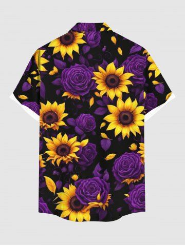 Plus Size Sunflower Rose Flower Print Hawaii Button Pocket Shirt For Men - Purple - S