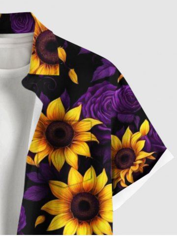 Plus Size Sunflower Rose Flower Print Hawaii Button Pocket Shirt For Men - Purple - Xl