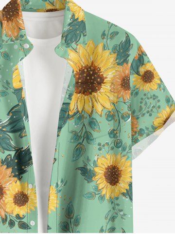 Plus Size Sunflowers Leaf Oil Painting Print Buttons Pocket Hawaii Shirt For Men - Green - S