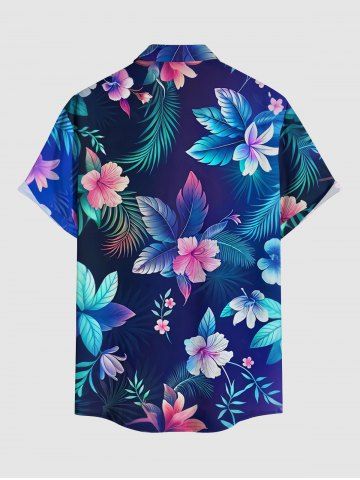 Plus Size Tropical Flowers Leaf Print Buttons Pocket Hawaii Shirt For Men - Deep Blue - S