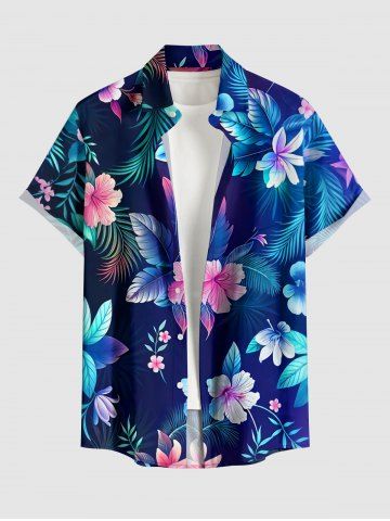 Plus Size Tropical Flowers Leaf Print Buttons Pocket Hawaii Shirt For Men - Deep Blue - Xl