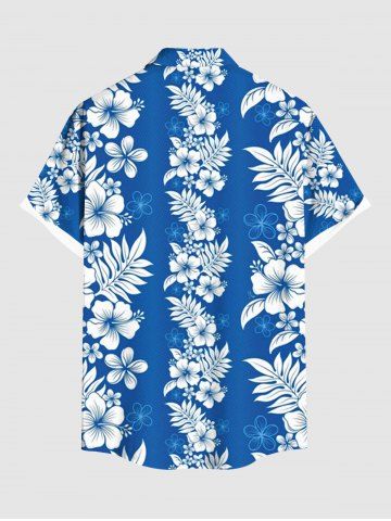Plus Size Tropical Hibiscus Flower Leaf Print Buttons Pocket Hawaii Shirt For Men - Blue - 3xl