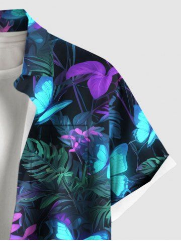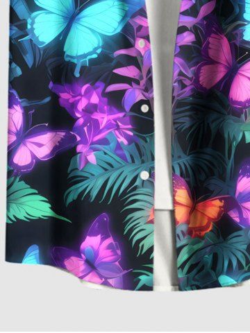 Plus Size Tropical Leaf Branch Colorful Glitter Butterfly Print Hawaii Button Pocket Shirt For Men - Black - 6xl
