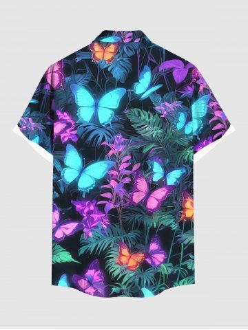 Short Sleeves Shirts > Plus Size Tropical Leaf Branch Colorful Glitter Butterfly Print Hawaii Button Pocket Shirt For Men