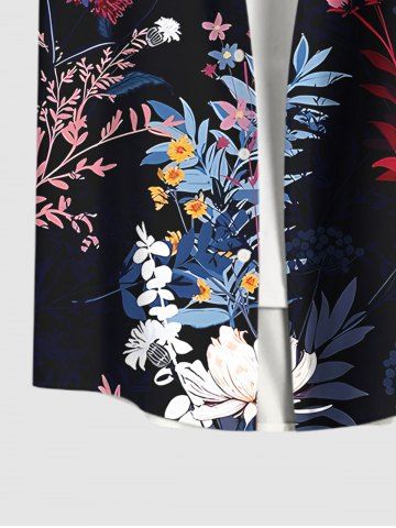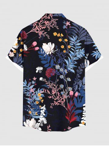 Plus Size Tropical Leaf Branch Flower Print Hawaii Button Pocket Shirt For Men - Black - M