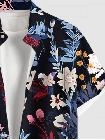 Plus Size Tropical Leaf Branch Flower Print Hawaii Button Pocket Shirt For Men - Black - 4xl