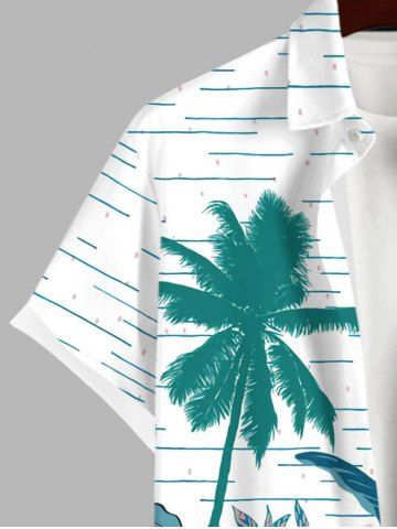 Short Sleeves Shirts > Plus Size Tropical Leaf Coconut Tree Line Print Hawaii Button Pocket Shirt For Men