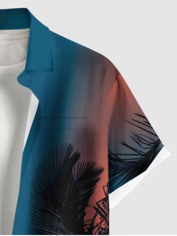 Plus Size Tropical Leaf Coconut Tree Ombre Print Buttons Pocket Hawaii Shirt For Men - Blue - L