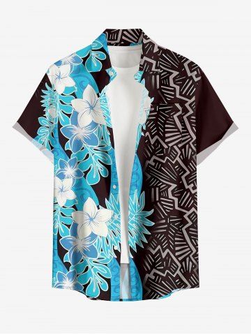 Plus Size Tropical Leaf Flower Ethnic Print Hawaii Button Pocket Shirt For Men - Light Blue - M