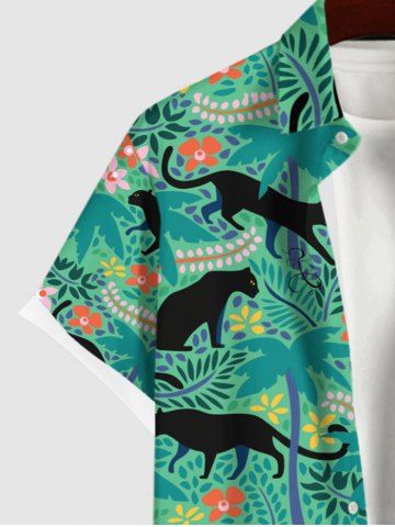 Plus Size Tropical Leaf Flower Leopard Print Buttons Pocket Hawaii Shirt For Men - Green - Xl
