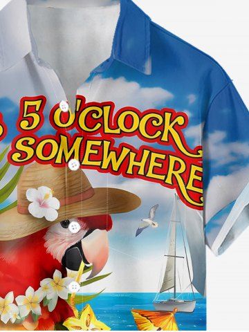 Plus Size Tropical Leaf Flower Parrot Flamingo Sea Print Hawaii Button Pocket Shirt For Men - Blue - L