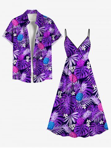 Plus Size Tropical Leaf Flower Pineapple Print Buttons Pocket Hawaii Shirt For Men - Purple - Xl