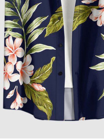 Plus Size Tropical Leaf Flower Print Hawaii Button Pocket Shirt For Men - Deep Blue - 4xl