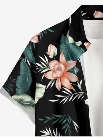 Plus Size Tropical Leaf Flower Print Hawaii Button Pocket Shirt For Men - Black - L