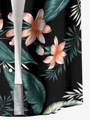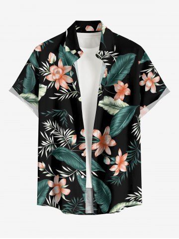 Plus Size Tropical Leaf Flower Print Hawaii Button Pocket Shirt For Men - Black - 3xl