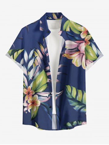 Plus Size Tropical Leaf Flower Print Hawaii Button Pocket Shirt For Men - Deep Blue - 2xl