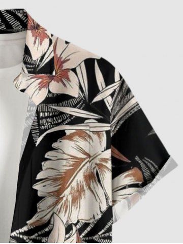 Plus Size Tropical Leaf Flower Print Hawaii Button Pocket Shirt For Men - Black - S