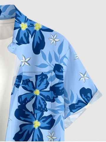 Plus Size Tropical Leaf Flower Print Hawaii Button Pocket Shirt For Men - Sky Blue - 3xl