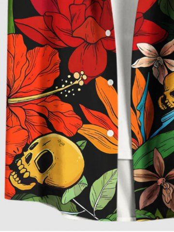 Short Sleeves Shirts > Plus Size Tropical Leaf Flower Skull Print Hawaii Button Pocket Shirt For Men