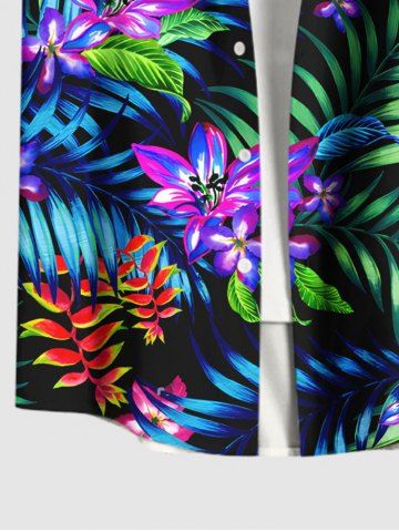 Plus Size Tropical Leaf Flowers Print Buttons Pocket Hawaii Shirt For Men - Black - M