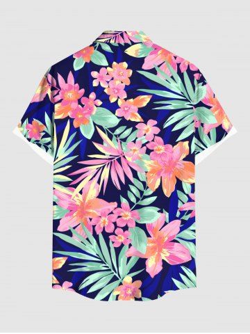 Plus Size Tropical Leaf Flowers Print Buttons Pocket Hawaii Shirt For Men - Blue - Xl