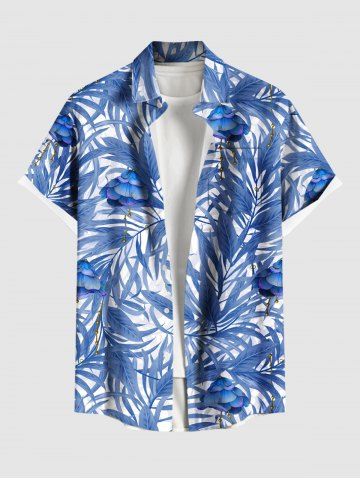 Plus Size Tropical Leaf Flowers Print Buttons Pocket Hawaii Shirt For Men - Blue - 2xl