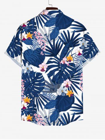 Plus Size Tropical Leaf Flowers Print Buttons Pocket Hawaii Shirt For Men - Blue - L