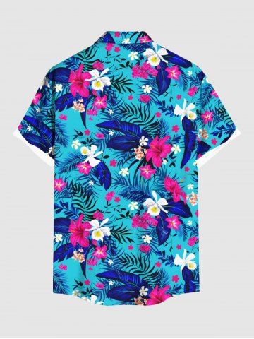 Plus Size Tropical Leaf Hbiscus Flowers Print Buttons Pocket Hawaii Shirt For Men - Sky Blue - S