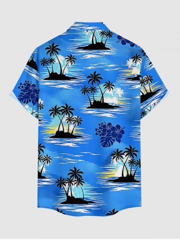 Short Sleeves Shirts > Plus Size Tropical Leaf Hibiscus Flower Coconut Tree Sea Print Hawaii Button Pocket Shirt For Men