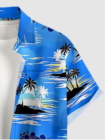 Plus Size Tropical Leaf Hibiscus Flower Coconut Tree Sea Print Hawaii Button Pocket Shirt For Men - Sky Blue - M
