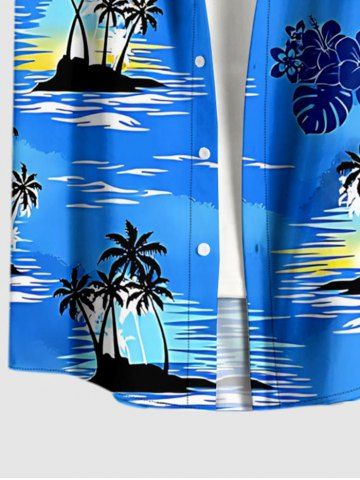 Plus Size Tropical Leaf Hibiscus Flower Coconut Tree Sea Print Hawaii Button Pocket Shirt For Men - Sky Blue - L