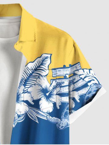 Short Sleeves Shirts > Plus Size Tropical Leaf Hibiscus Flower Colorblock Print Buttons Pocket Hawaii Shirt For Men