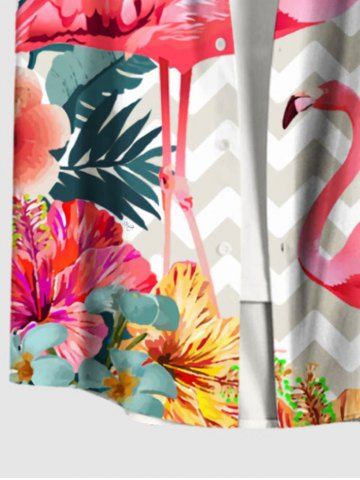 Plus Size Tropical Leaf Hibiscus Flower Flamingo Zig Zag Print Hawaii Button Pocket Shirt For Men - White - S